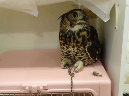 새장 위에 웅크려 앉아 있는 올빼미. 일본 동물권리센터(ARC)
