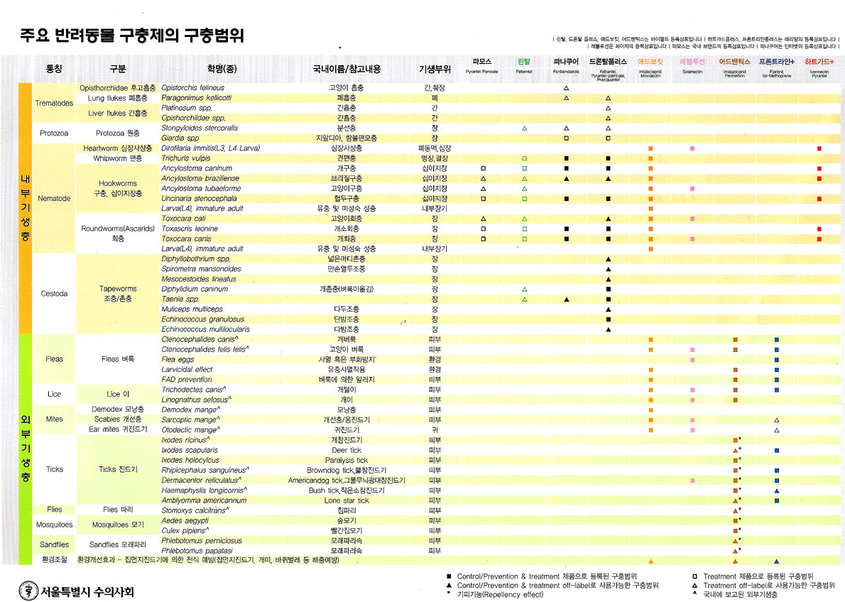 주요 반려동물 구충제의 구충범위를 서울특별시 수의사회에서 정리해놓은 표를 참고해보시고