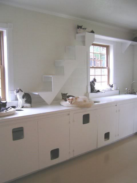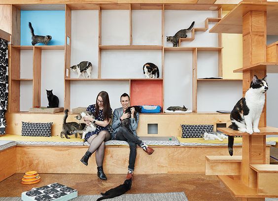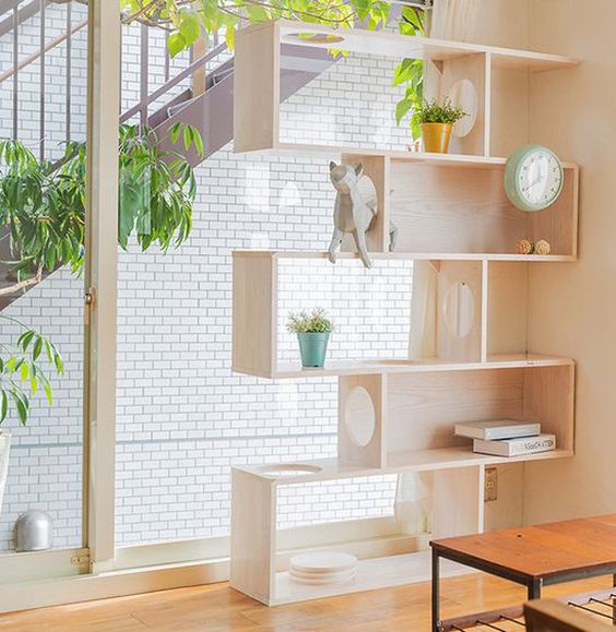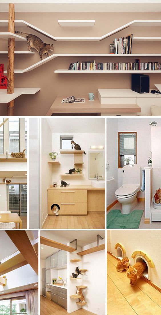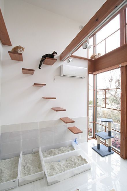 벽을 책장처럼 짜넣어 고양이들 이용할 수 있게 만든 형태네요