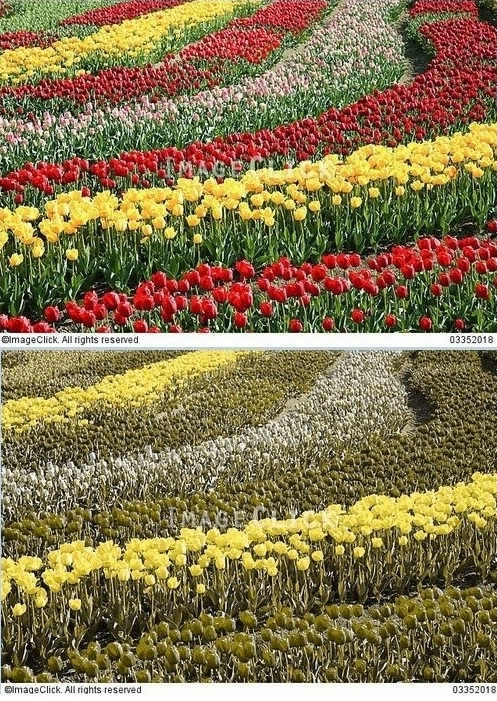 일반적인 사람이 보게되는 아름다운 튤립밭의 풍경을 적록색맹이 있는 사람이나 고양이가 보기에는 아래 사진처럼 단조로운 풍경으로 보이게 됩니다.