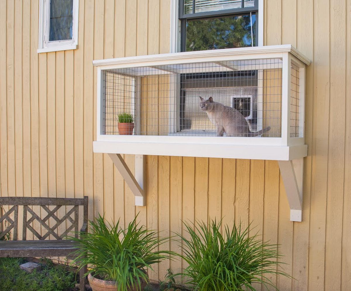캣티오의 형태 역시 굉장히 다양해요. 썬룸이나 유리온실처럼 규모를 크게 만들 수도 있지만 이렇게 고양이 한마리가 편하게 창문 밖의 풍경을 구경할 수 있을 정도의 아주 작은 캣티오도 많이 사용됩니다.