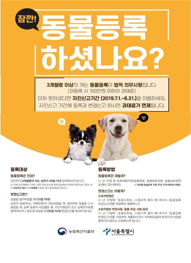 농림축산식품부는 동물등록을 활성화하고자 1일(오늘)부터 8월 31일까지 2개월간 자진신고 기간을 운영한다.