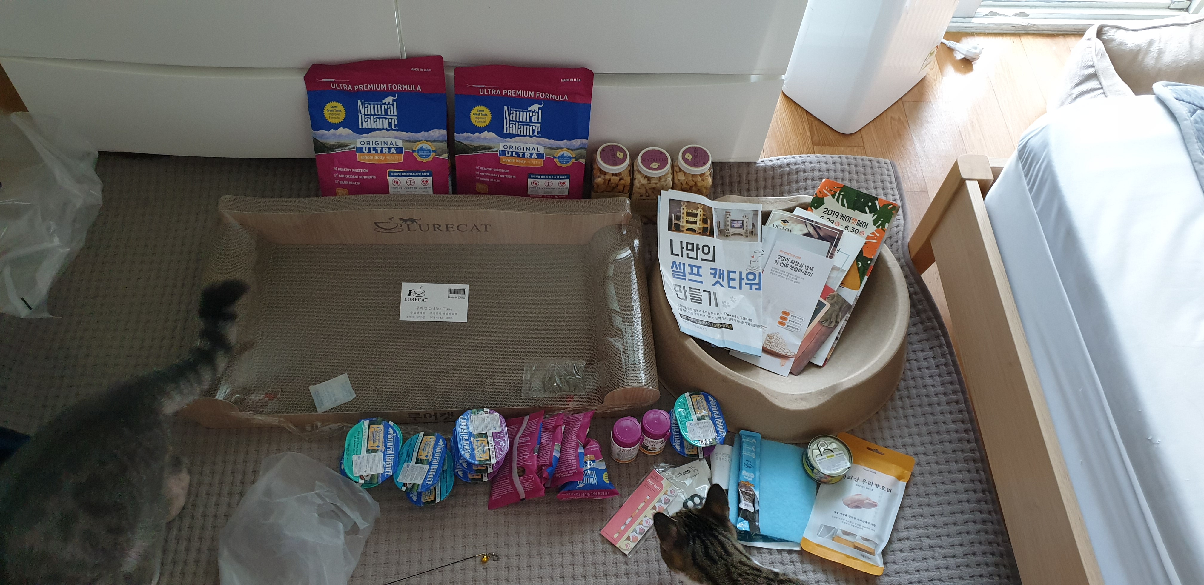 항상 사는 내추럴발란스 사료 1+1, 스튜캔 10개, 플라그오프 2개, FD트릿 가자미 3개, 스크래처, 종이박스,