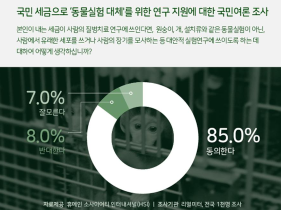 85%가 찬성할 만큼 많은 사람들이 동물실험이 꼭 필요하지 않다는것을 인지하고 있었습니다.